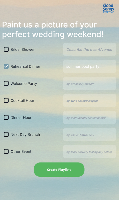 Determine which events you need a playlist for, and describe the venue, style and more!