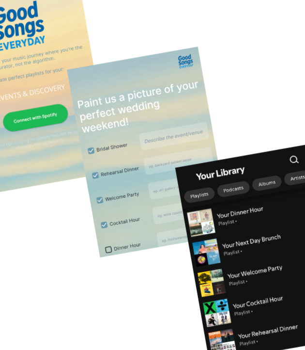 Within minutes, the playlists are in your Spotify account! Share, edit, and listen to your personalized playlists across all wedding weekend events.